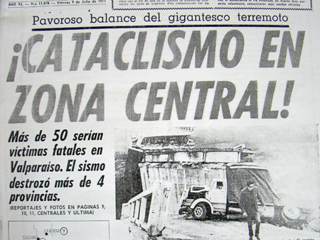 1971 - Un terremoto, a las 23:04 afecta a varias ciudades; Illapel, Cabildo, Valparaíso y Santiago, son las más dañadas. En su tiempo fue llamado el terremoto de "La Manivela", programa televisivo humorístico de gran audiencia y que se estaba transmitiendo al momento del terremoto.